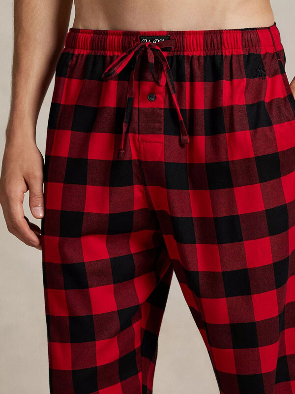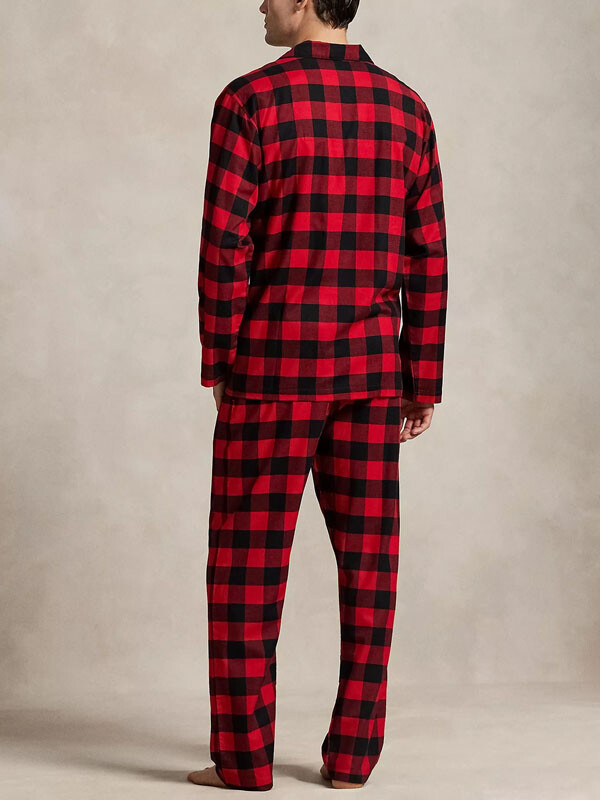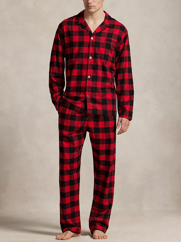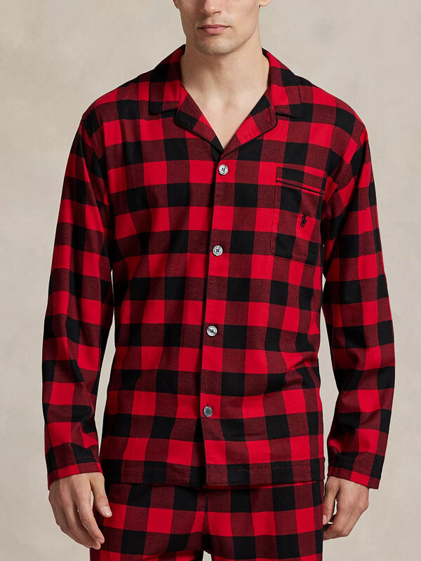 showcasing a classic buffalo check button-up shirt paired with matching drawstring pants.